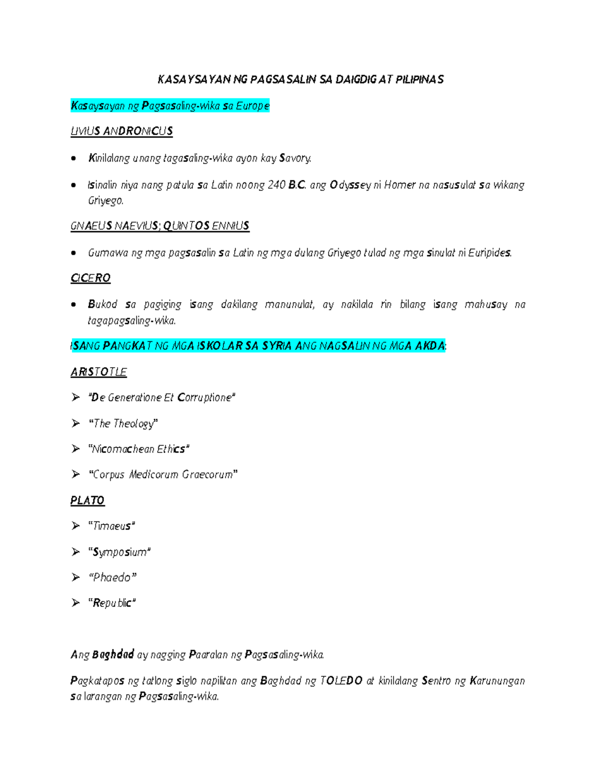 SOLUTION: Kasaysayan ng Pagsasalin sa Daigdig at sa Pilipinas - Studypool