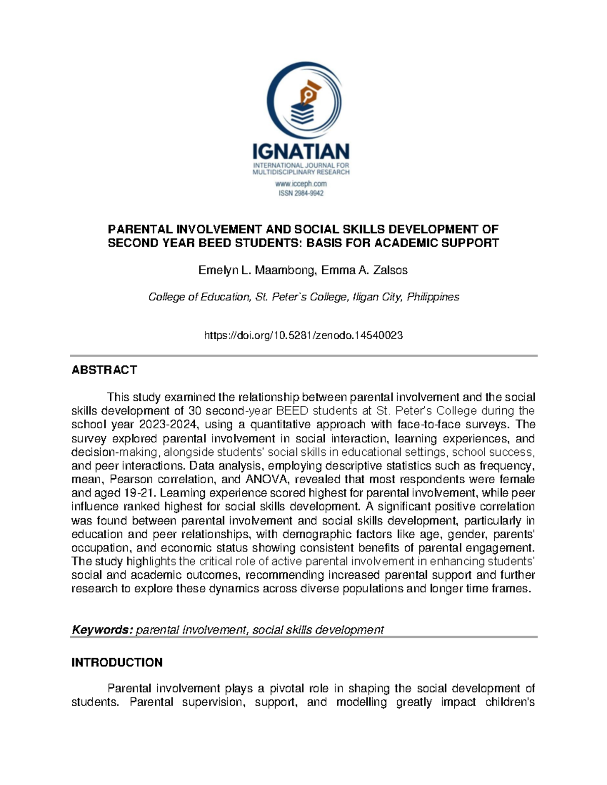 Parental Involvement and Social Skills Development in 2nd Year BEED ...