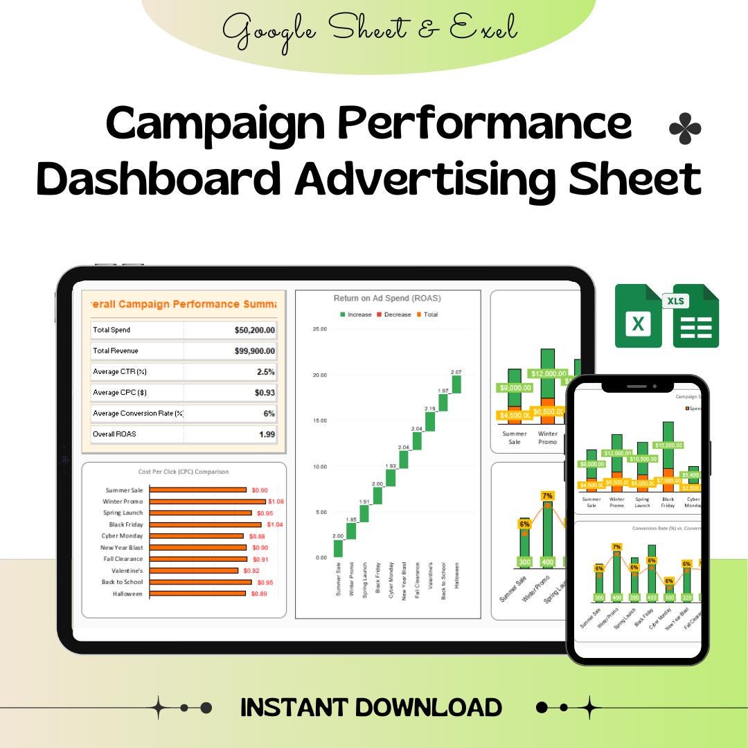 Campaign Performance Dashboard | Advertising Metrics Sheet for Excel ...
