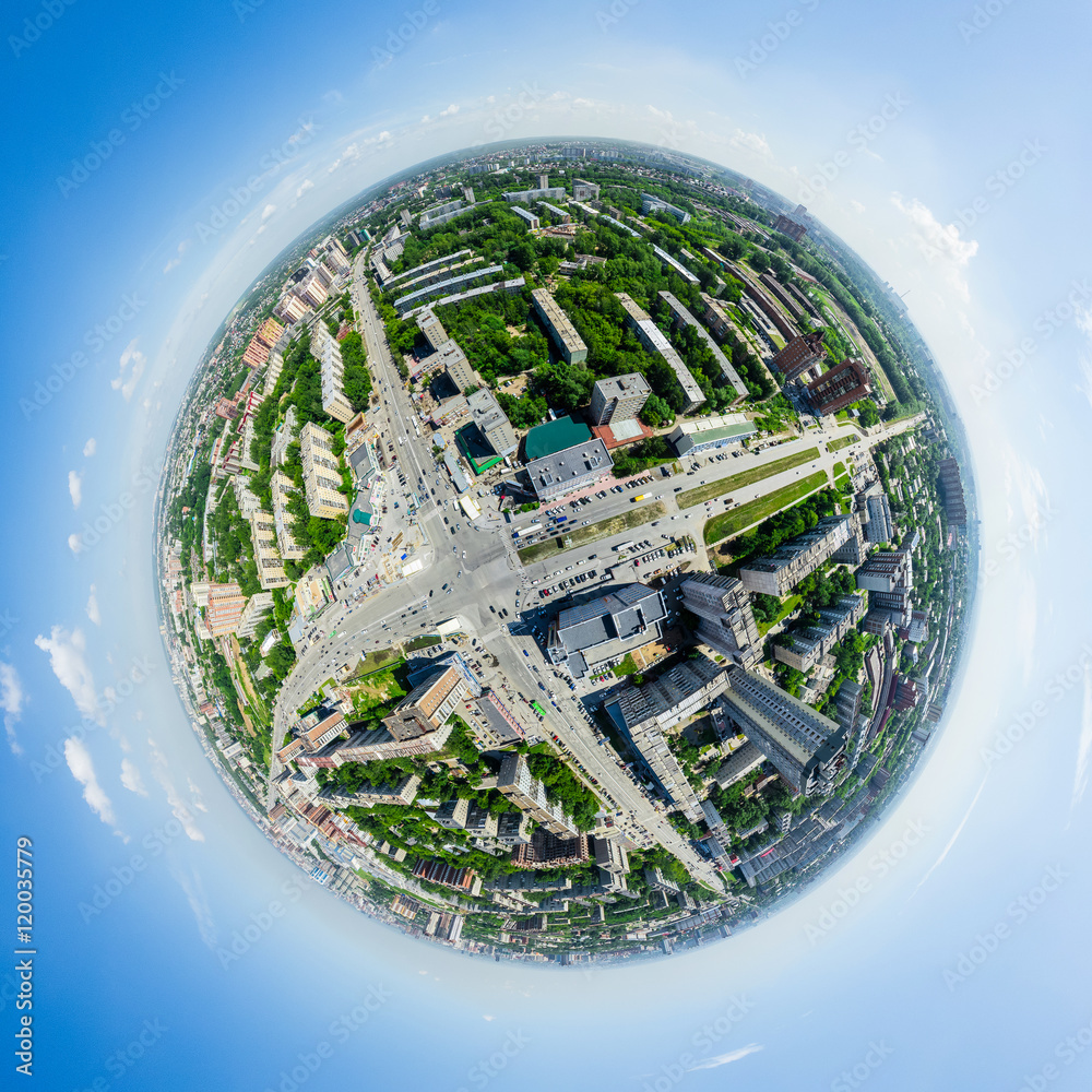 Aerial city view with crossroads, roads, houses, buildings, parks and ...