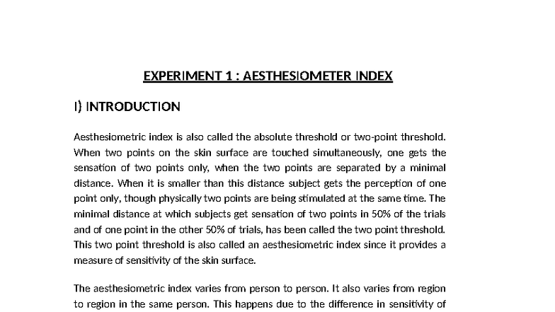 Aesthesiometer Experiment 1: Determining Two-Point Threshold - Studocu