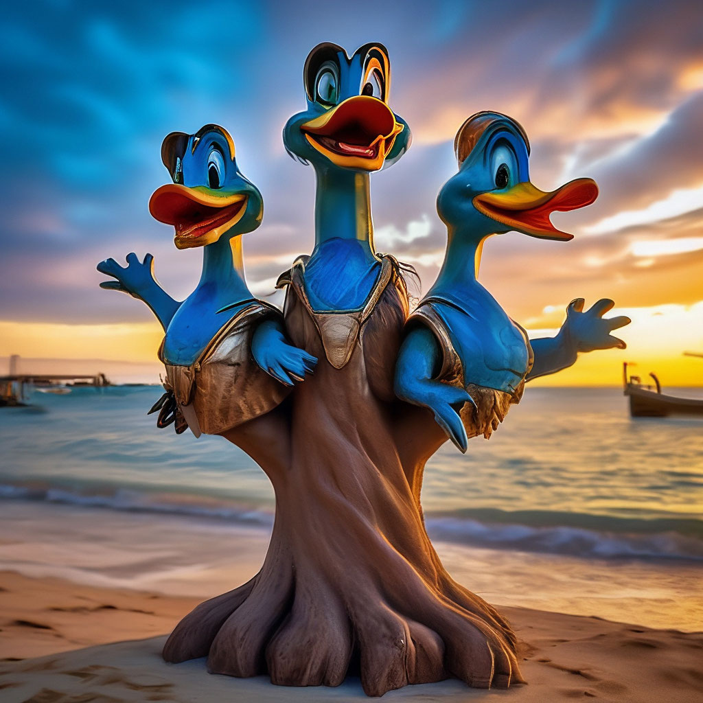 "A live three-headed palm tree, each head is a duck-nephew donald Duck ...