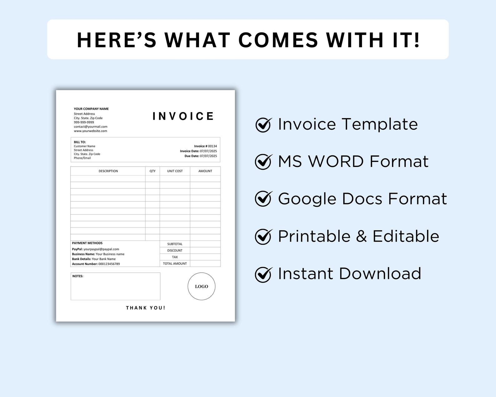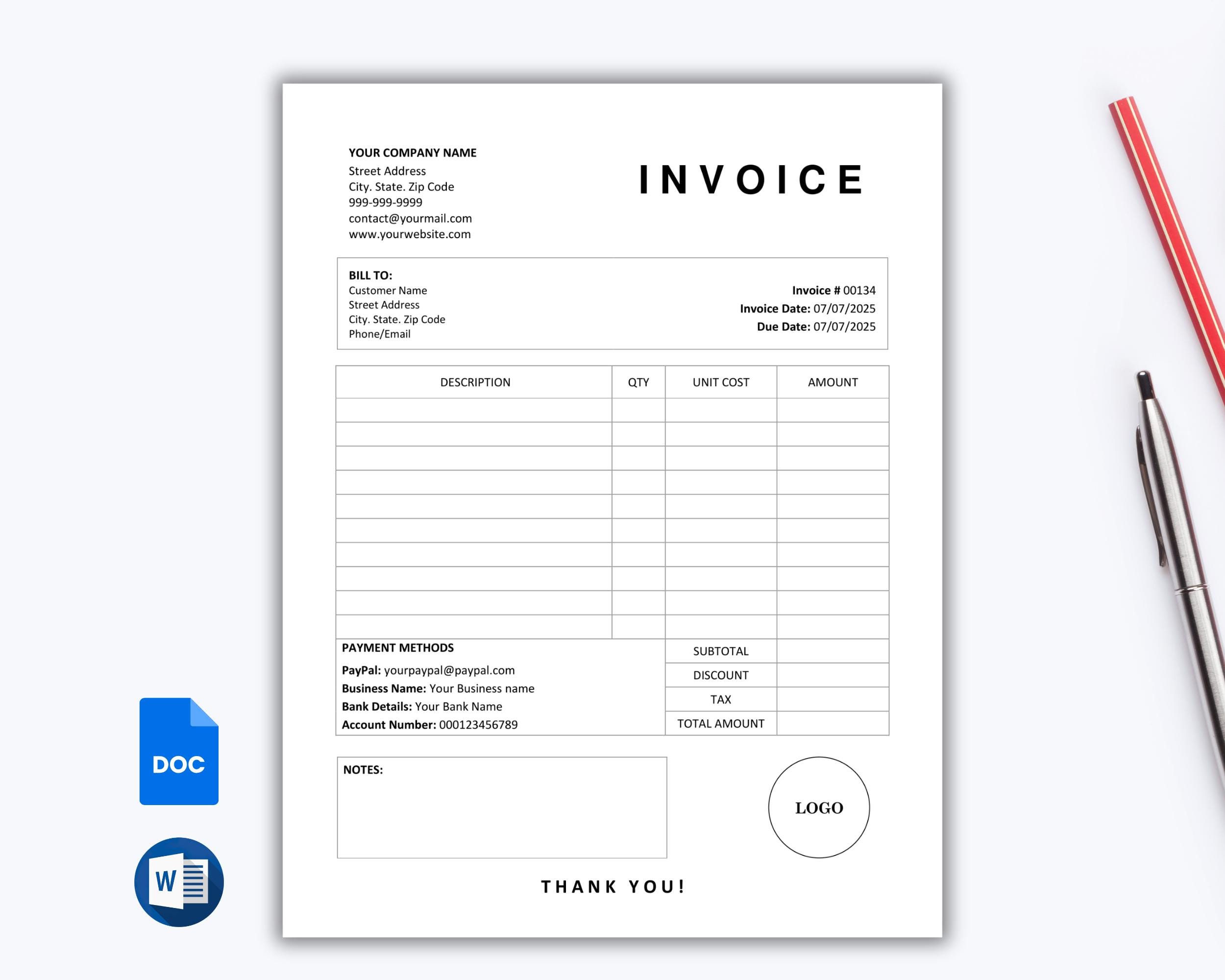 Editable Invoice Template: Printable Business Form (MS Word) - Etsy