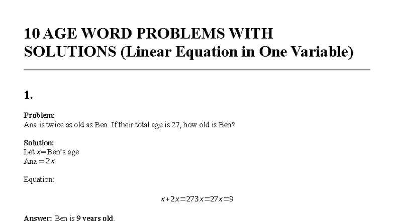 10 AGE WORD PROBLEMS WITH SOLUTIONS (Linear Equations) - Studocu