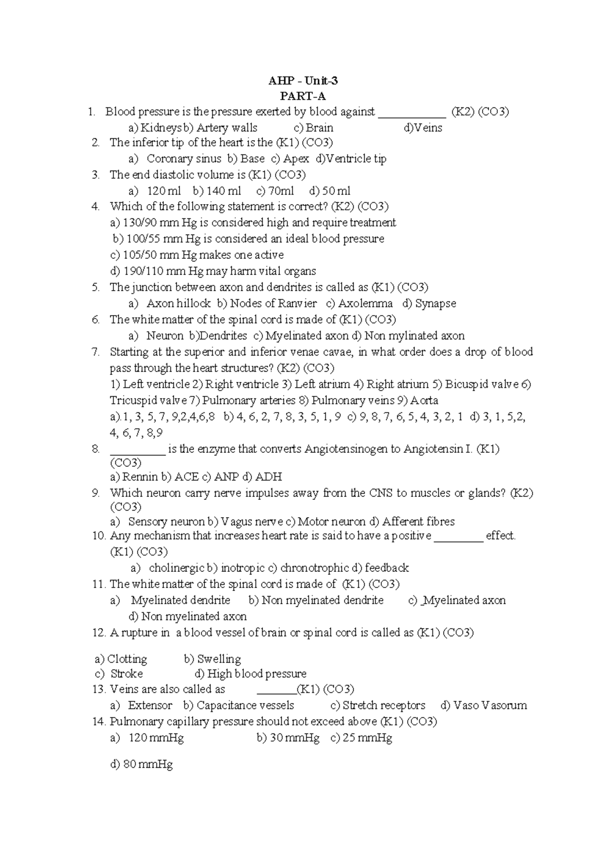AHP UNIT 3 QB - AHP QUESTION BANK - AHP - Unit- PART-A Blood pressure ...