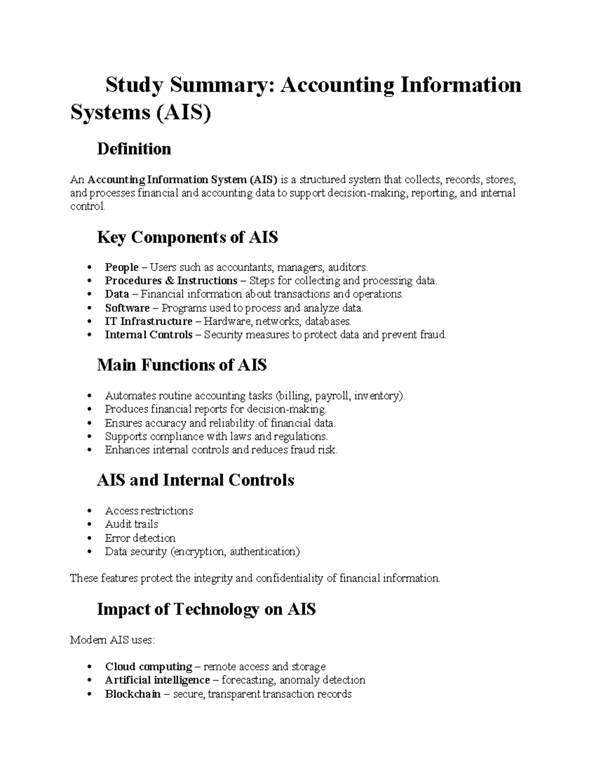 AIS Study Summary: Key Components & Functions of Accounting Info ...