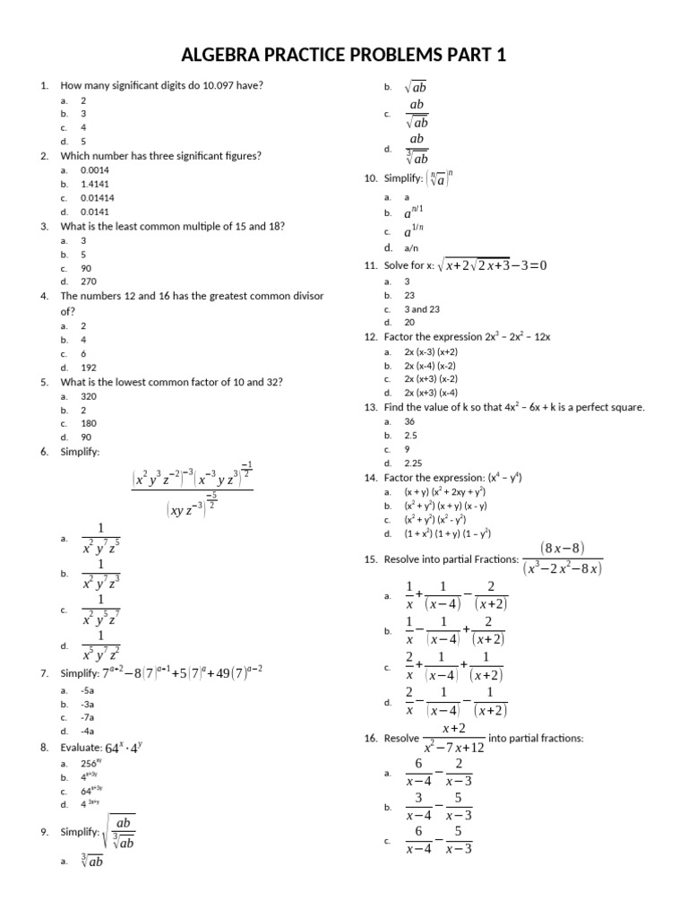Algebra Practice Problems 1 | PDF