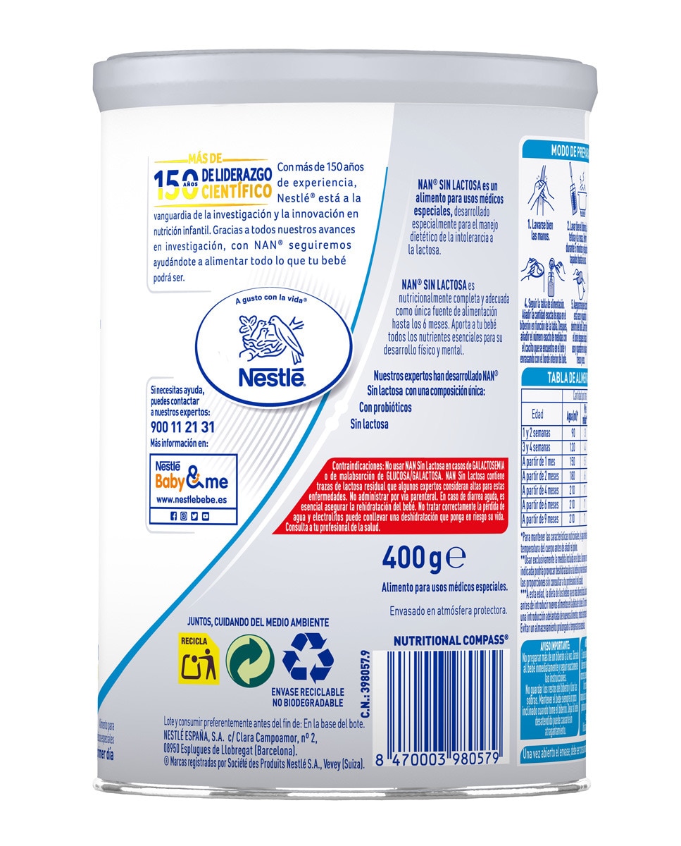NAN sin lactosa 400 g - fórmula para lactantes intolerantes