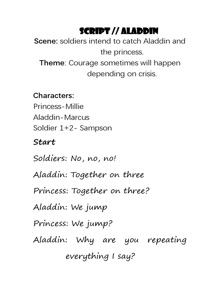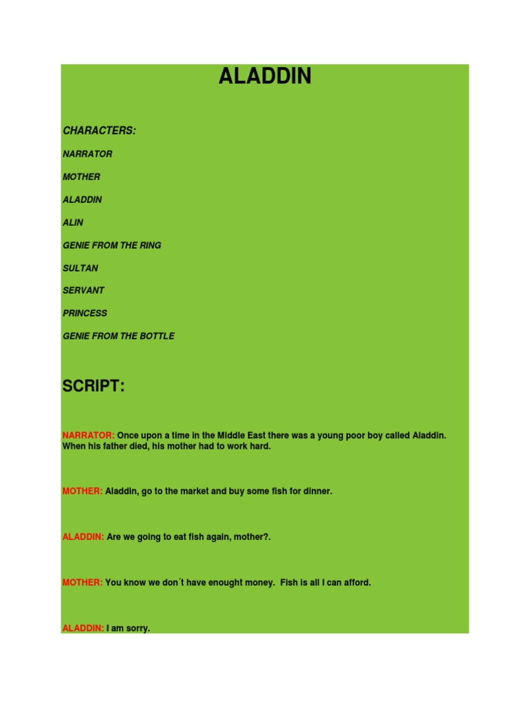 Aladdin´s script | Short drama script, Play scripts for kids, Role play ...