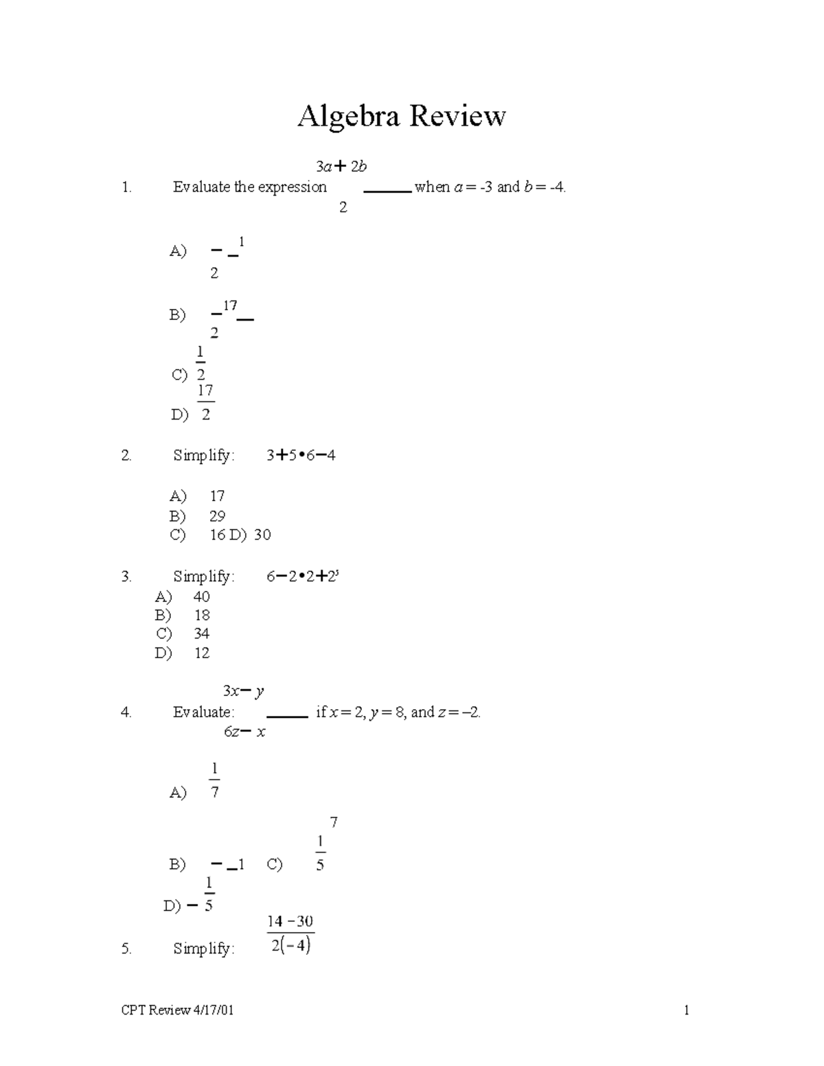 Algebra 101: Basic Problem Review and Answer Key - Studocu