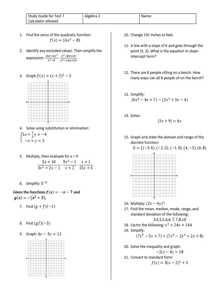 Algebra 2 Concepts - Midterm Study Guide by Creative Teacher | TPT