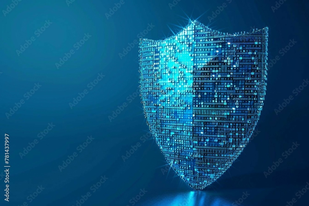 digital blue guard shield icon with glowing binary code, AI in security ...