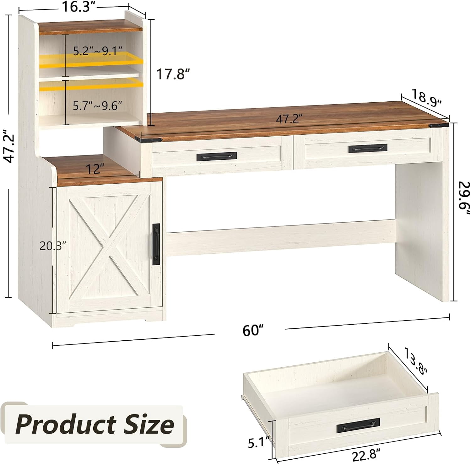 60 Inch Farmhouse Computer Desk with Drawers and Bookcase, Antique ...