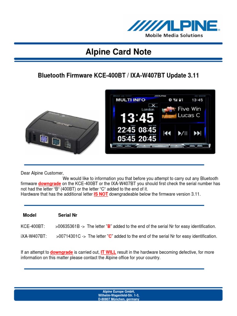 Alpine Card Note: Bluetooth Firmware KCE-400BT / IXA-W407BT Update 3.11 ...