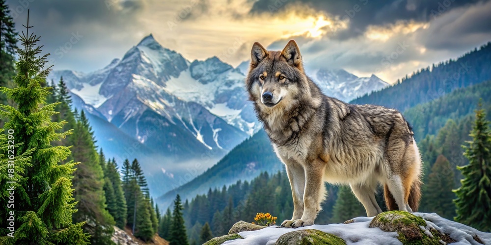 Majestic wolf blending into the alpine forest landscape Stock ...