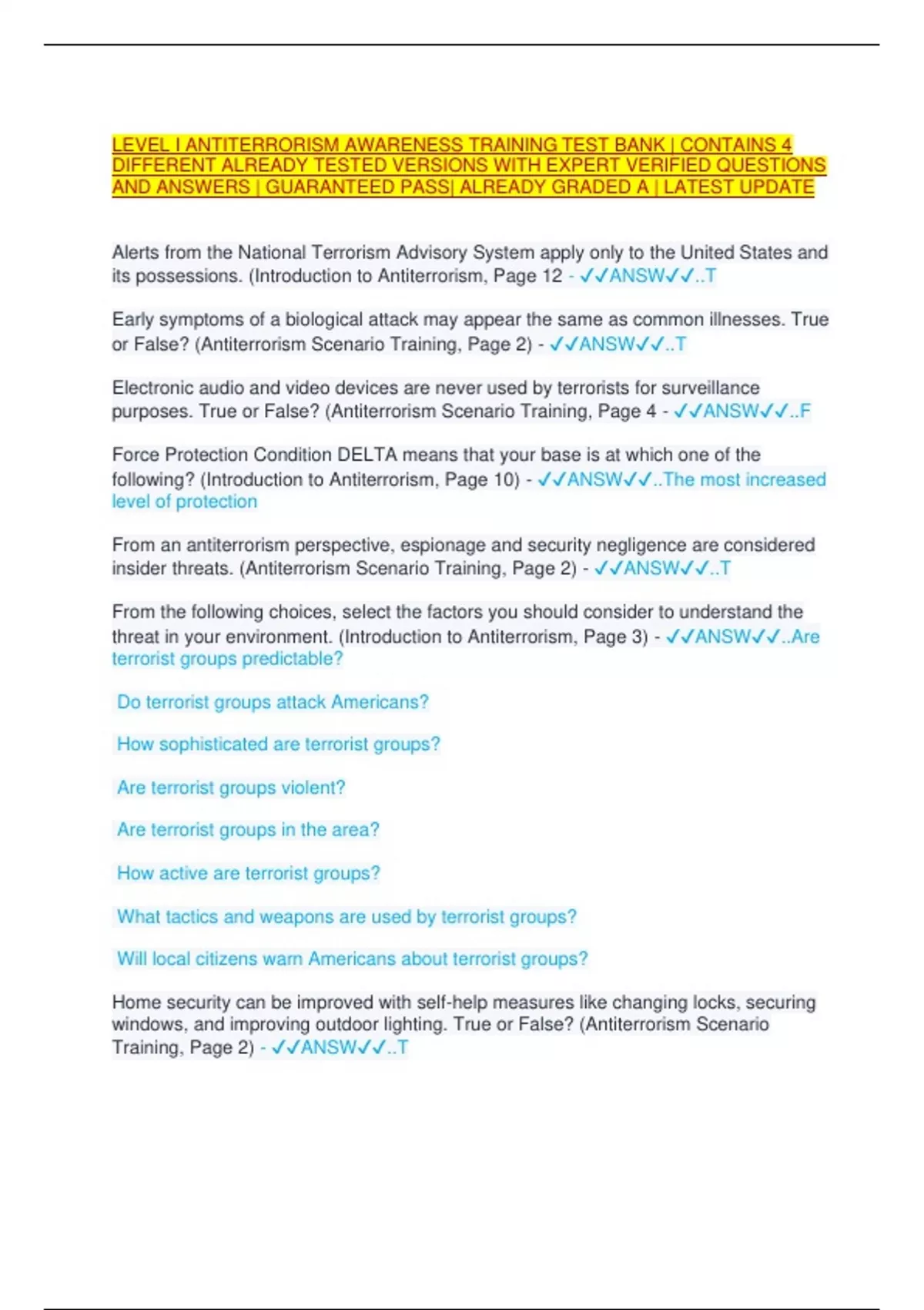 LEVEL I ANTITERRORISM AWARENESS TRAINING TEST BANK | CONTAINS 4 ...