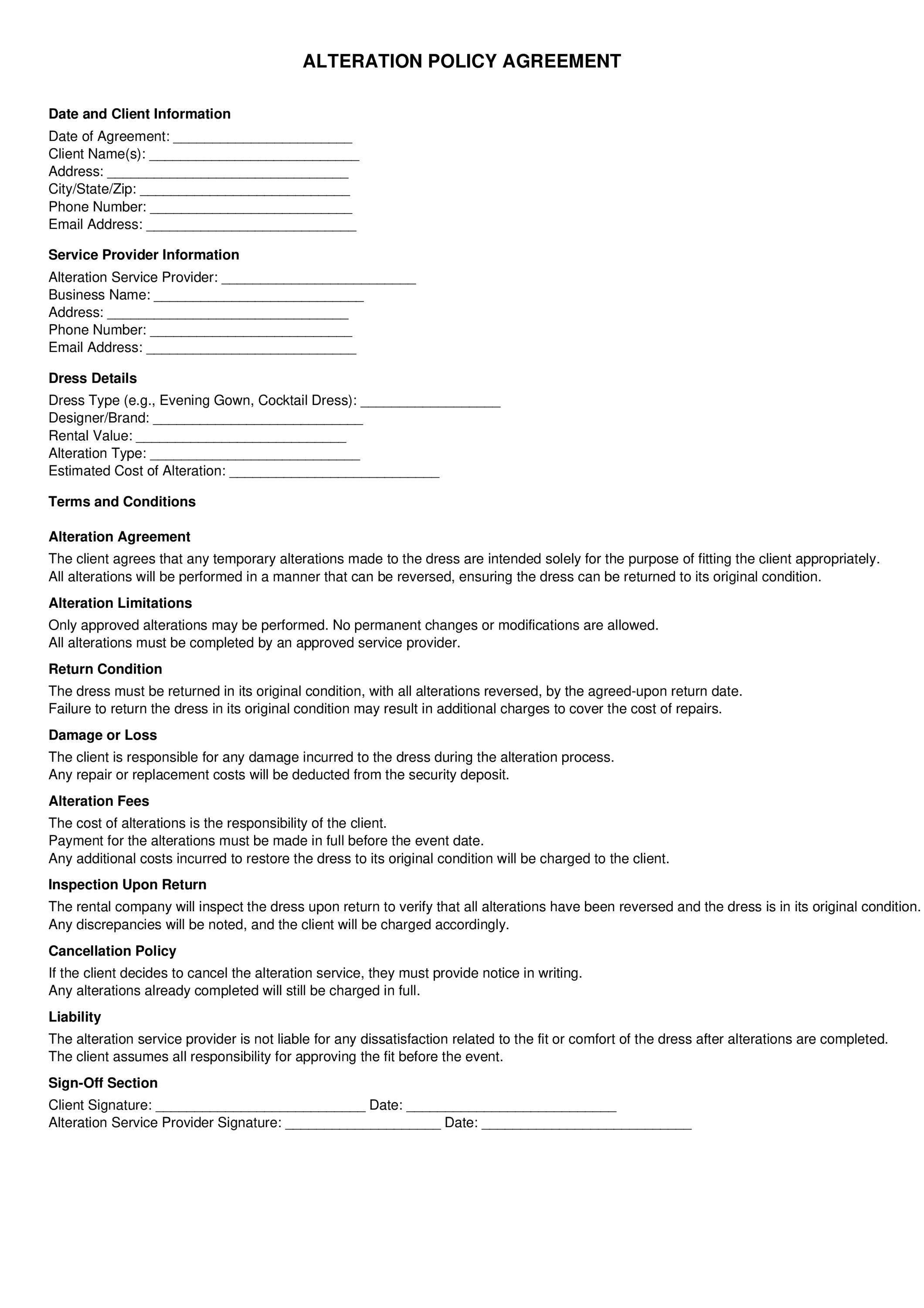 Alteration Policy Agreement | Dress Alteration Terms | Editable PDF - Etsy