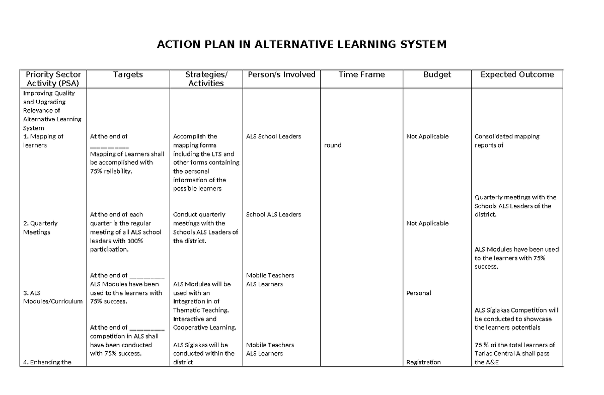 Action Plan in Alternative Learning System | PDF | Learning | Education ...