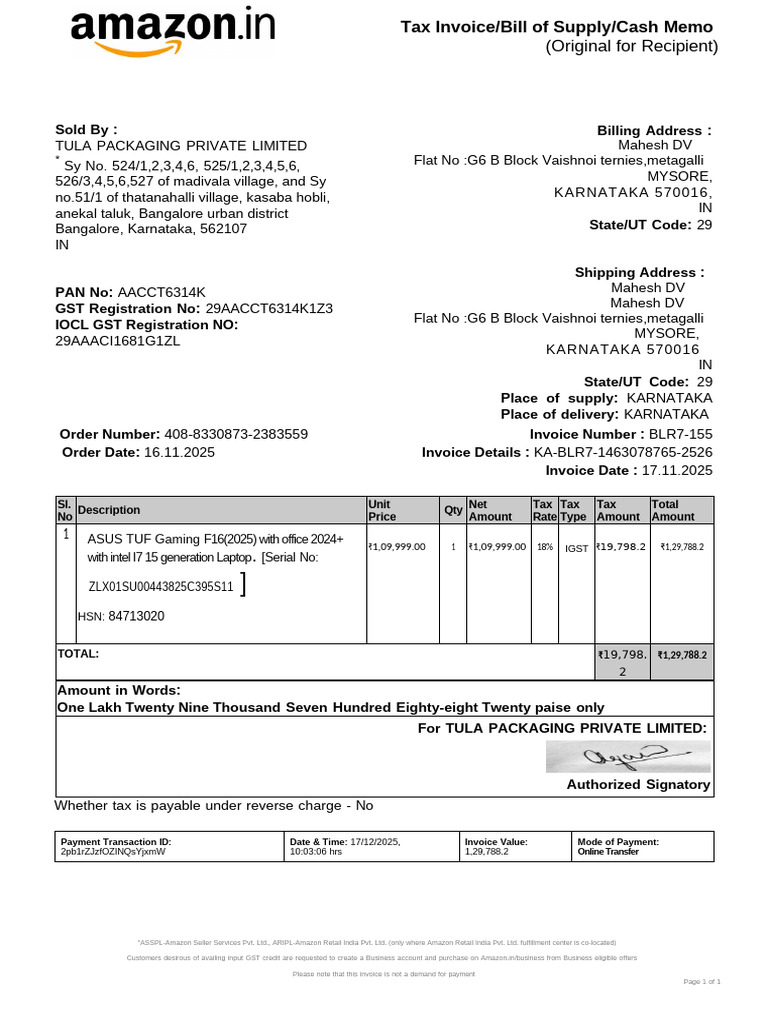 Amazon Invoice For Laptop | PDF | Invoice | Money