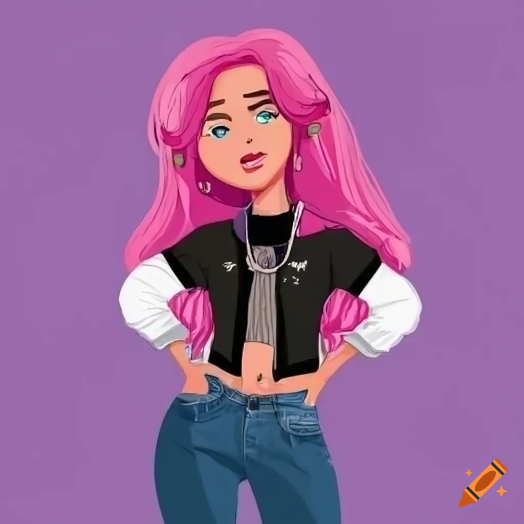 Popular girl with pink strait hair. pink varsity jacket black crop top ...