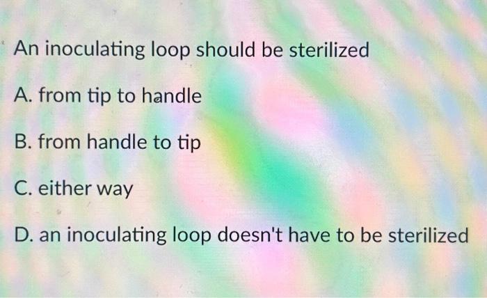 Solved An inoculating loop should be sterilized A. from tip | Chegg.com