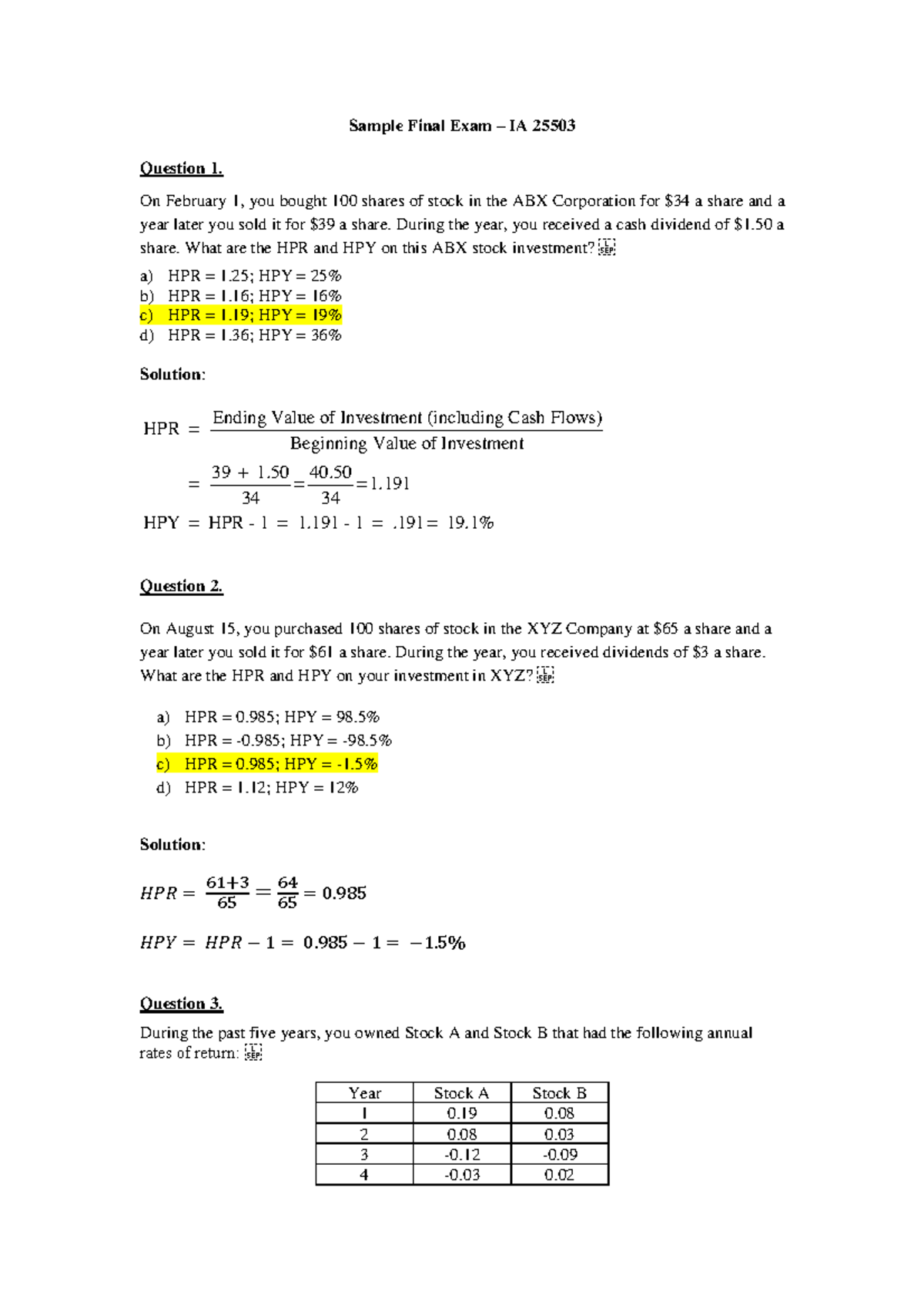 Investment Analysis Sample Exam + Answers - Sample Final Exam – IA ...