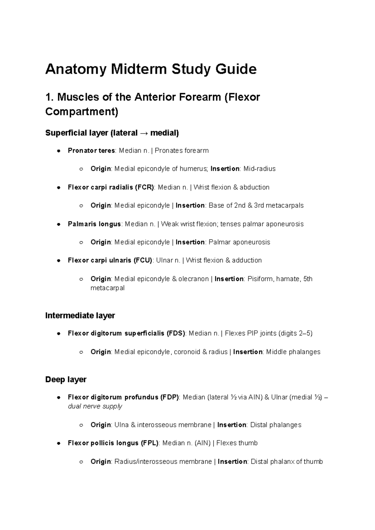 Anatomy Midterm Study Guide 1: Anterior & Posterior Forearm Muscles ...