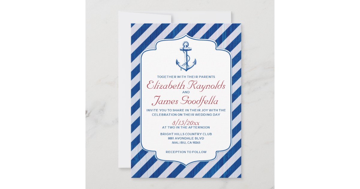 Navy blue white stripes anchor nautical weddings invitation zazzle ...