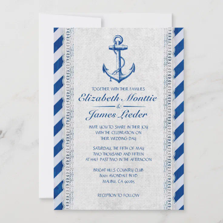 Nautical Anchor Wedding Invitation Template: Navy Blue Stripes ...