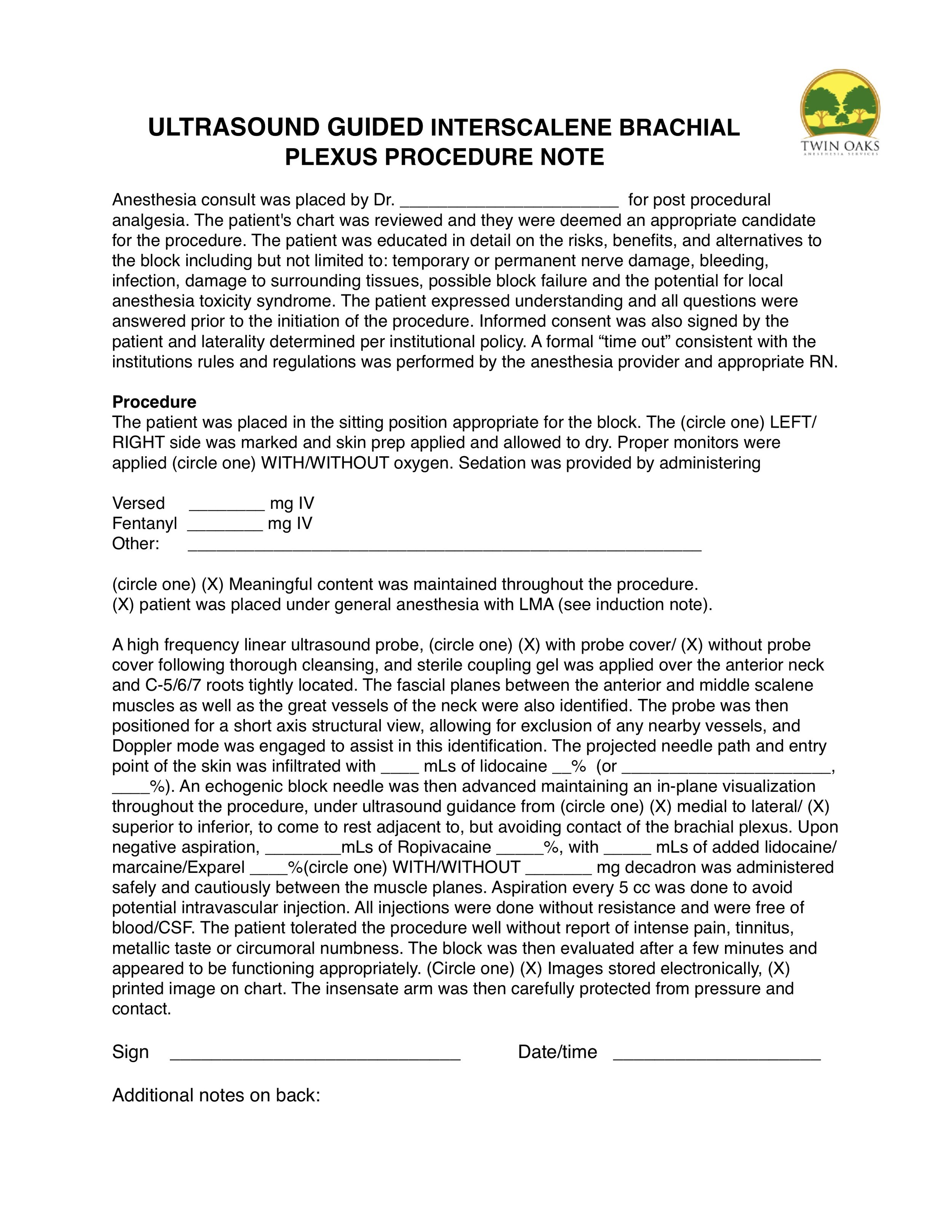 Procedure Notes — TWIN OAKS ANESTHESIA COURSES