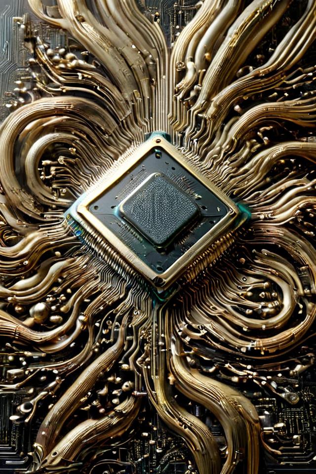 A close up of a computer chip on a gold plate - SeaArt AI