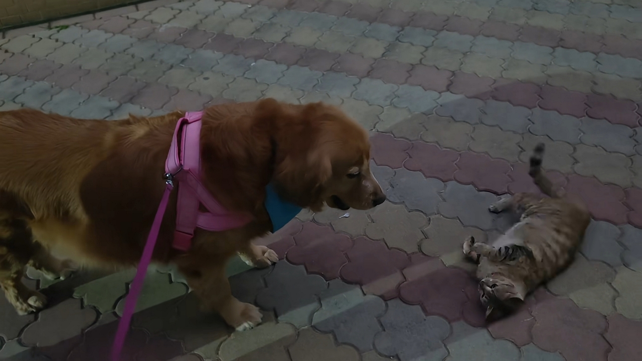 Golden retriever strolls with stray cats in China