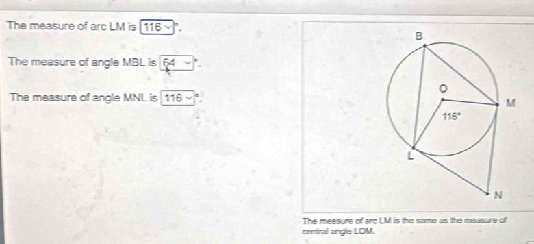 Solved: The measure of arc LM is [116 The measure of angle MBL is 64 ...
