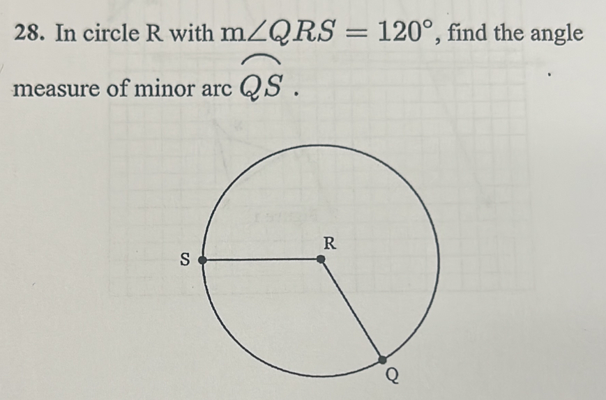 In circle R with m∠ QRS=120° , find the angle measure of minor arc ...
