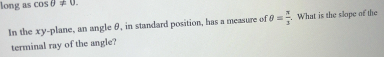 Gelöst:long as cos θ != 0. In the xy -plane, an angle θ, in standard ...