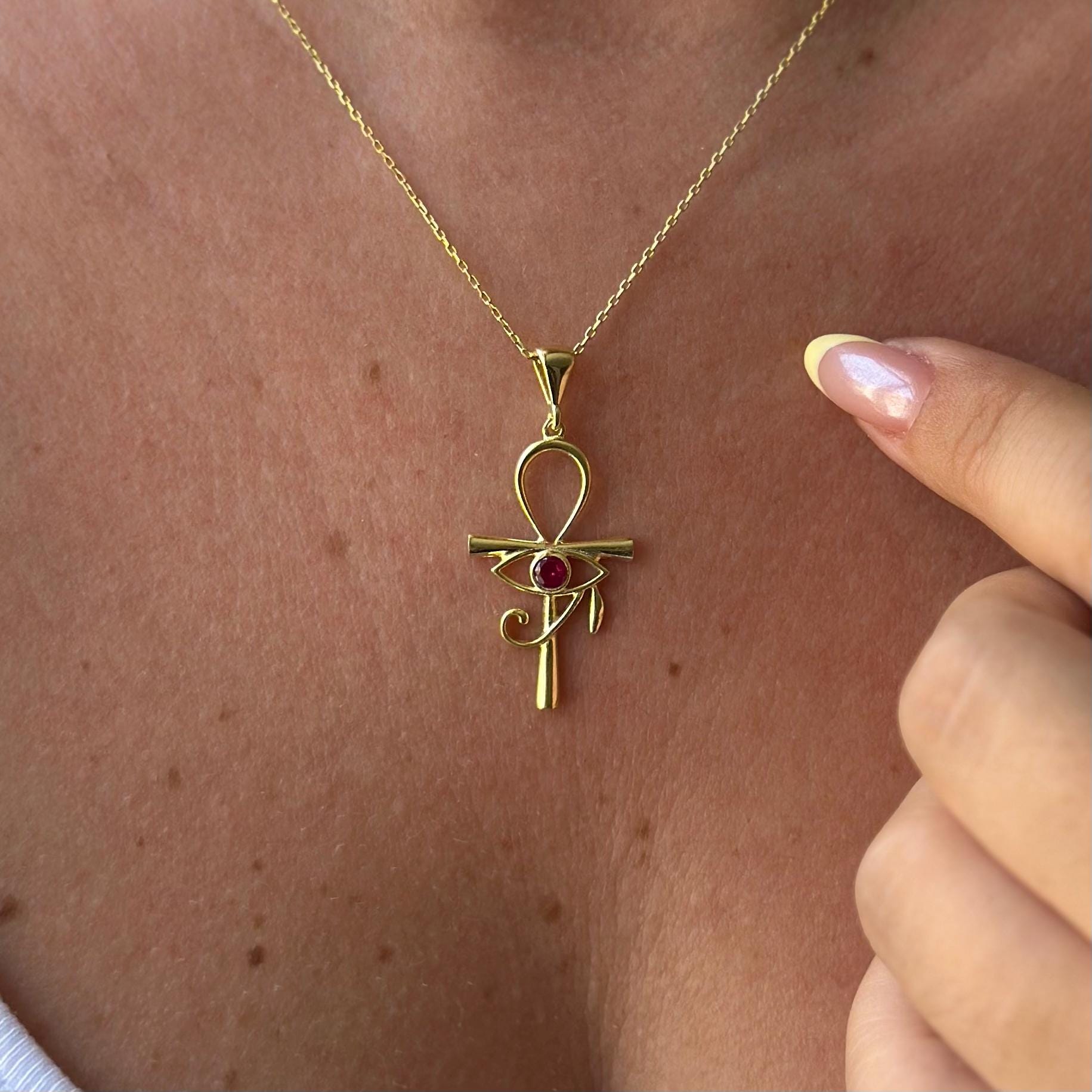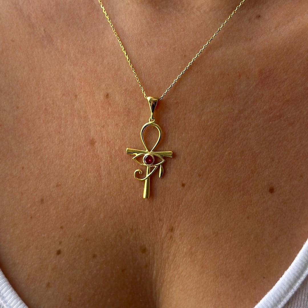 14k Gold Eye of Ra Necklace With Ruby Birthstone – Ankh Cross Jewelry ...