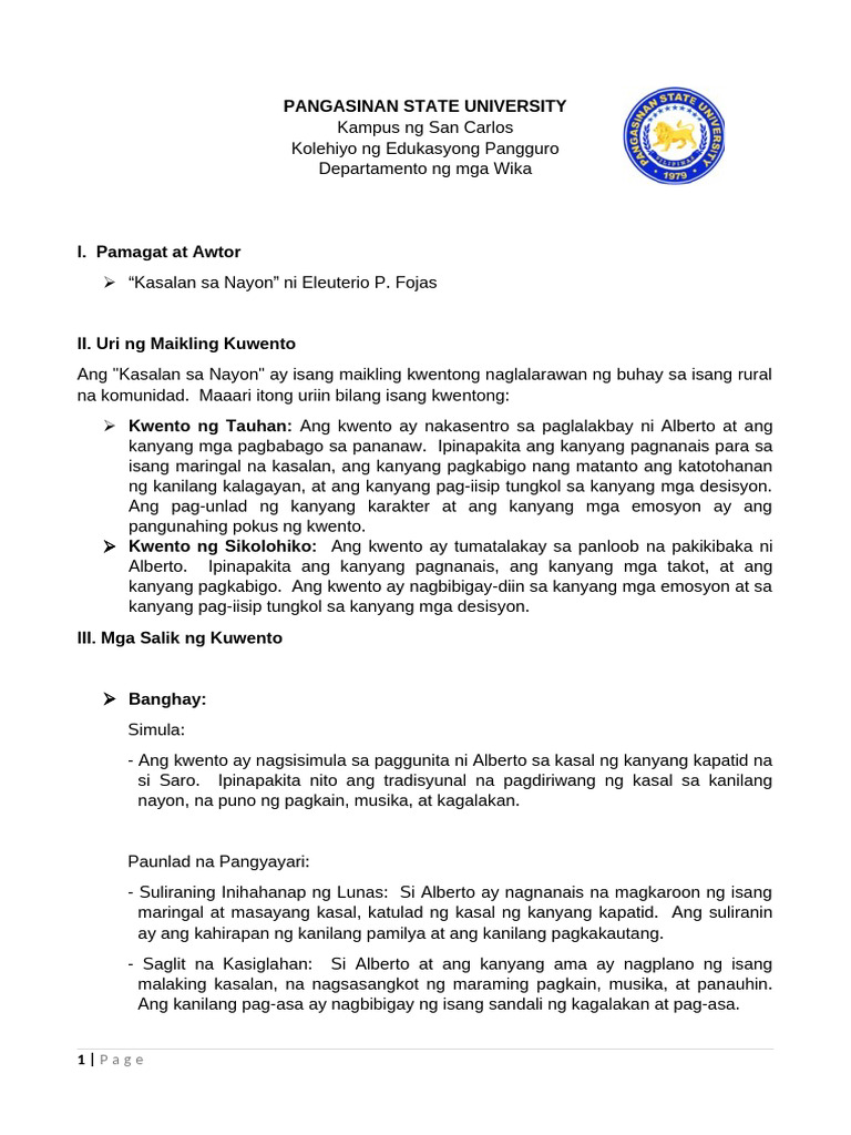 Pagsusuri sa mga akdang pampanitikan - I. Pamagat ng katha-May-Akda: A ...