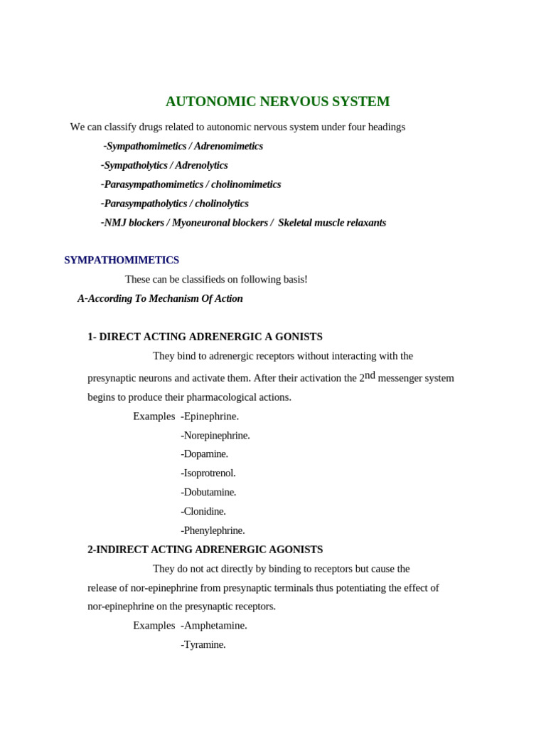 Drugs Acting On Autonomic Nervous System Adrenergic Drugs Notes - Class ...