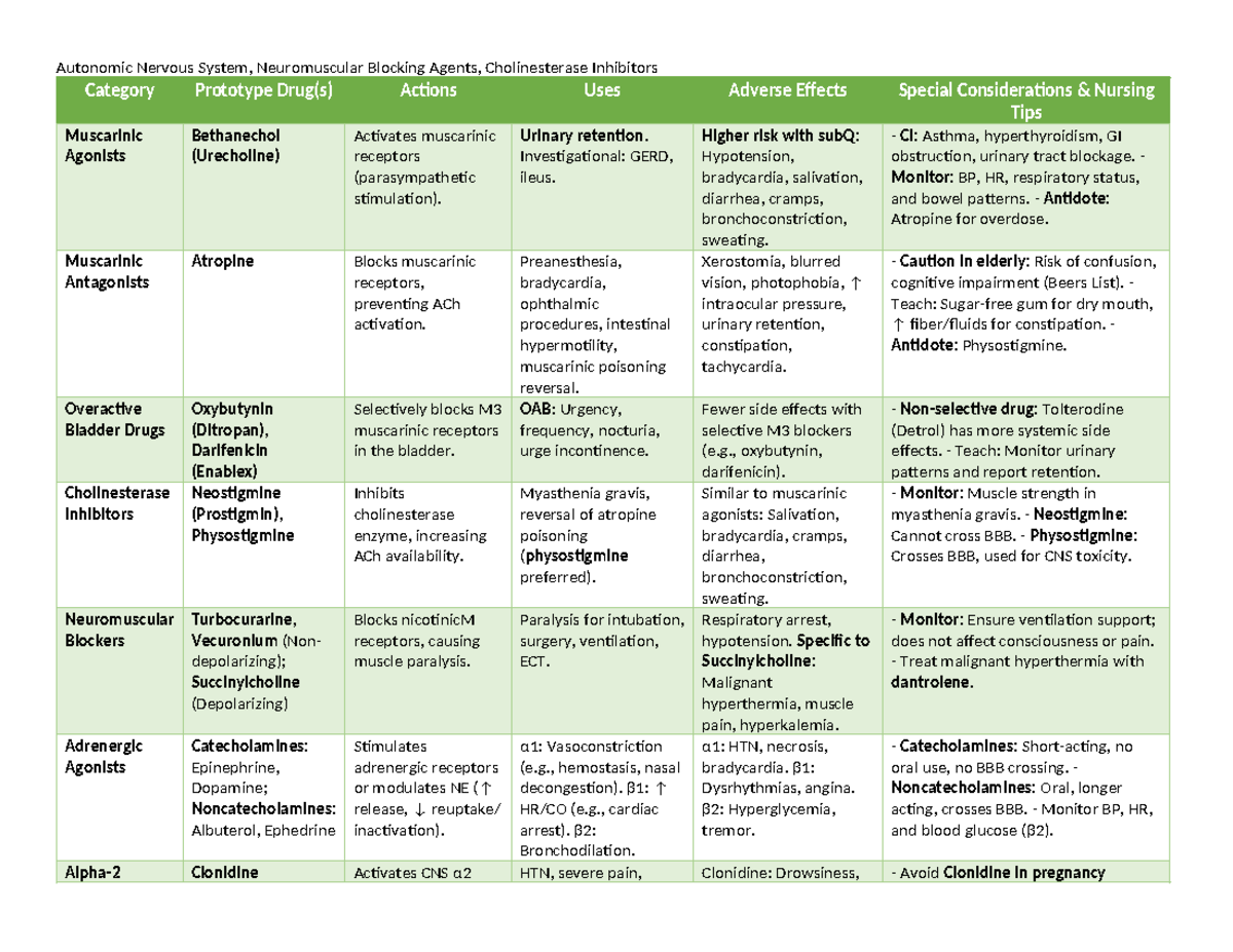 ANS Drug Chart - Autonomic Nervous System, Neuromuscular Blocking ...