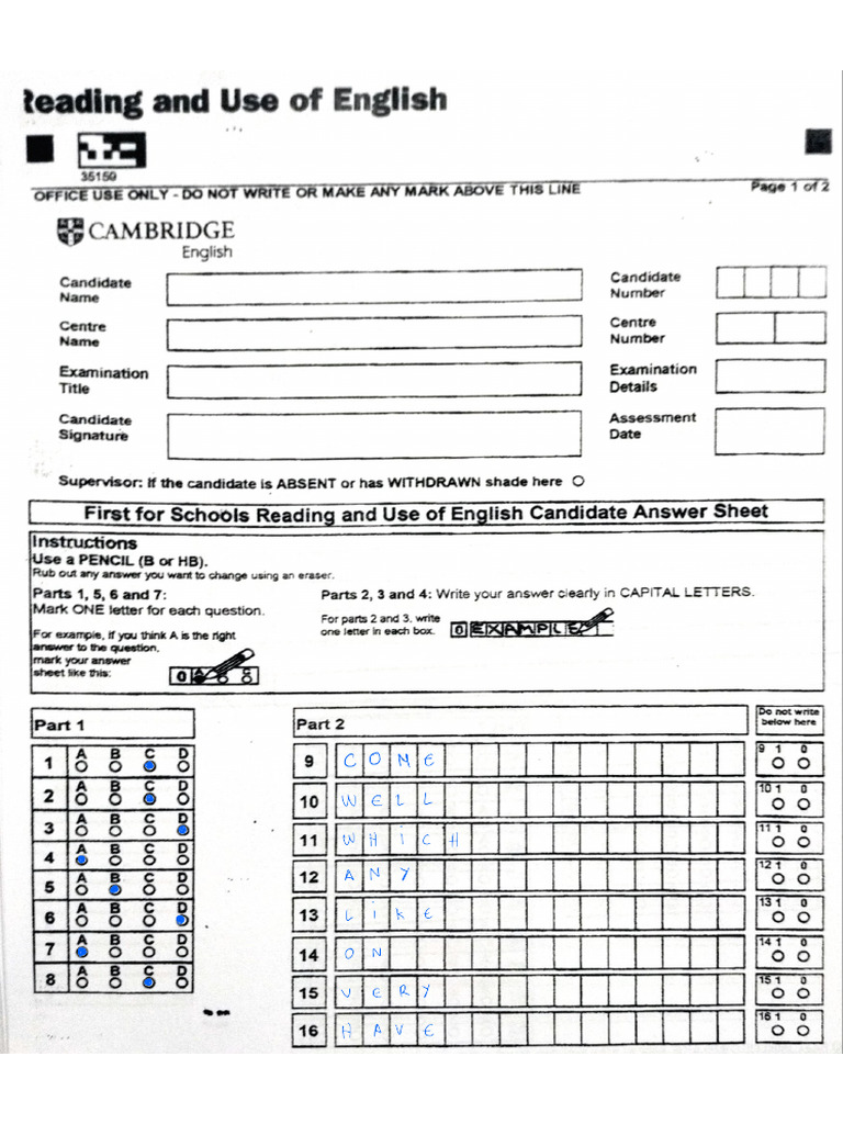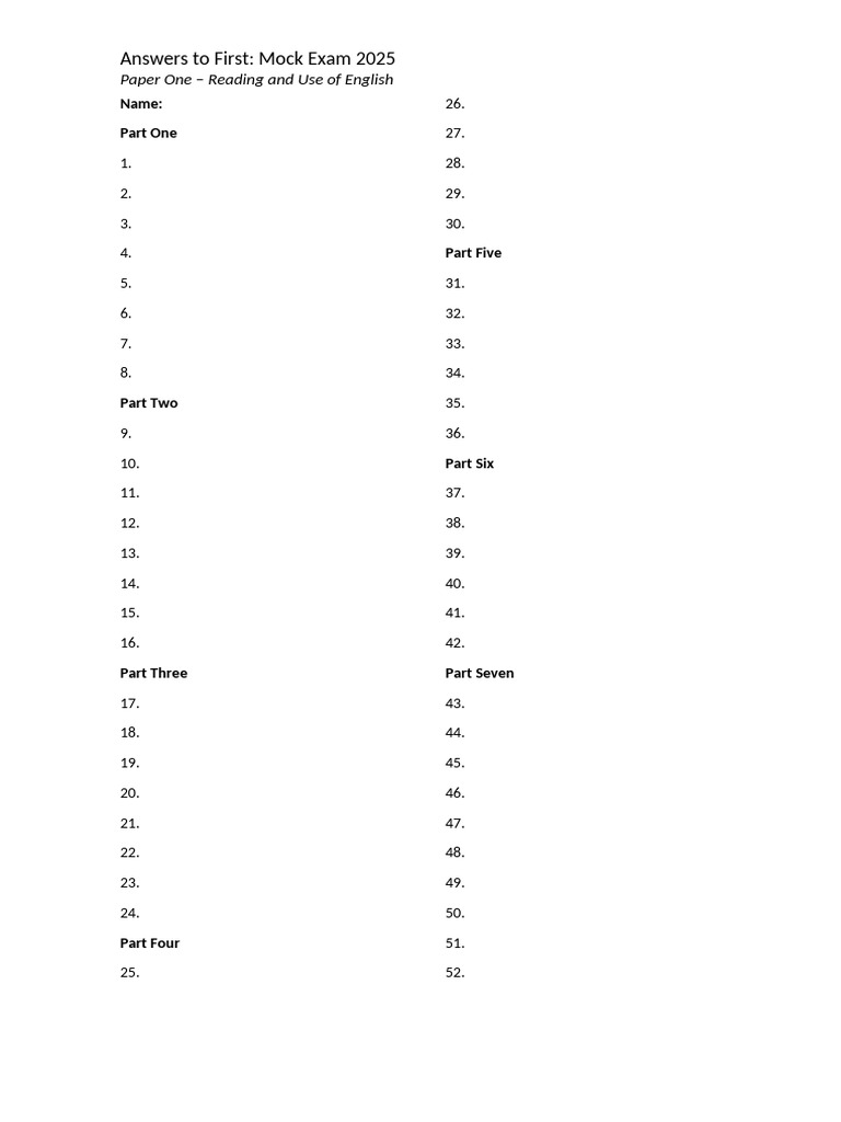 Answer Sheet - First - Paper One - Reading and Use of English | PDF