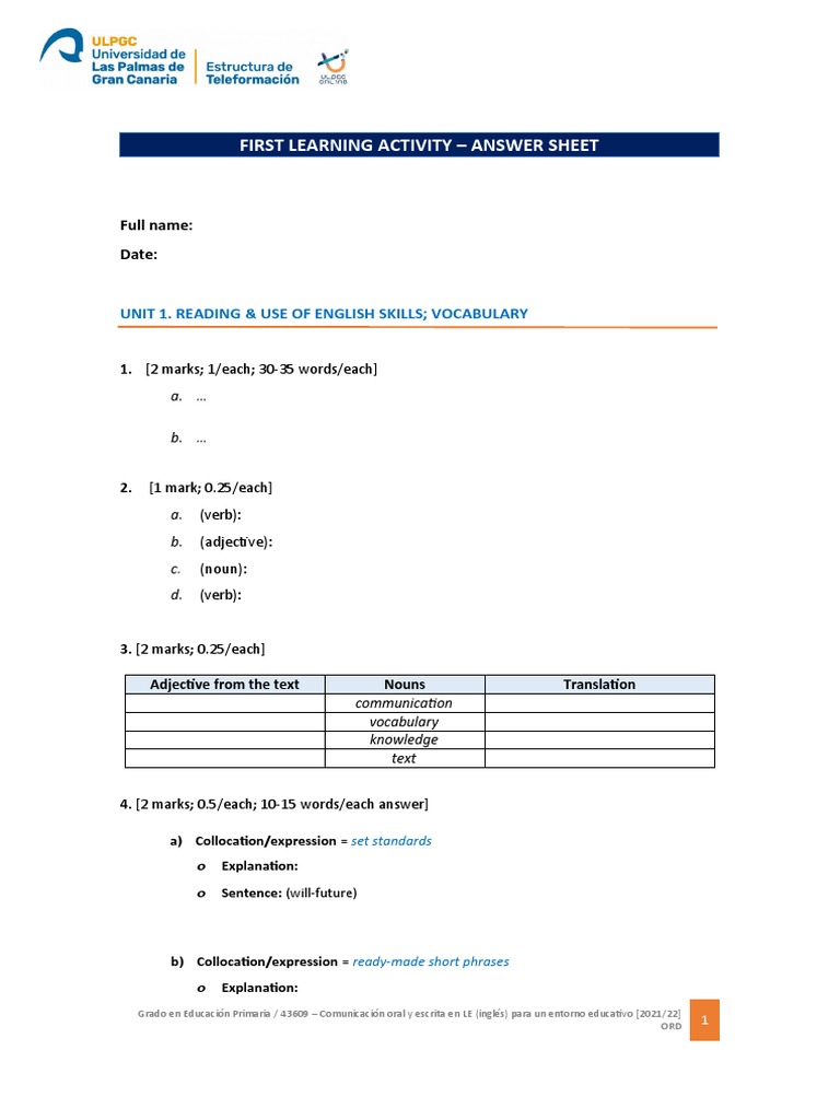 Answer Sheet Unit 1 (Lesson 1 + 2) | PDF
