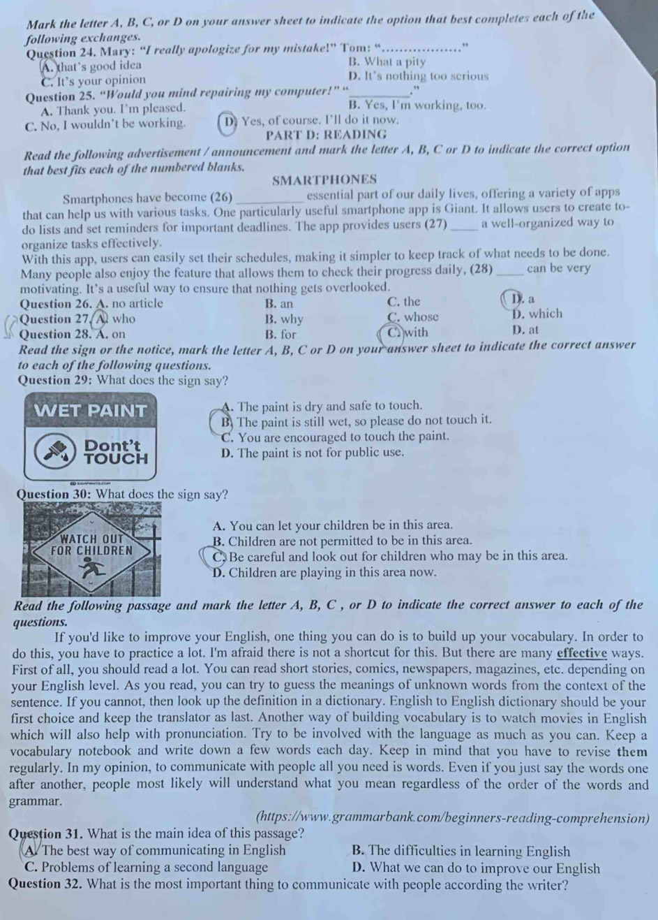 Giải quyết:Mark the letter A, B, C or D on your answer sheet to ...