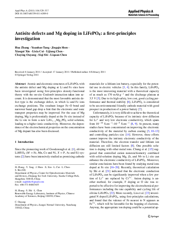 (PDF) Antisite defects and Mg doping in LiFePO4: a first-principles ...