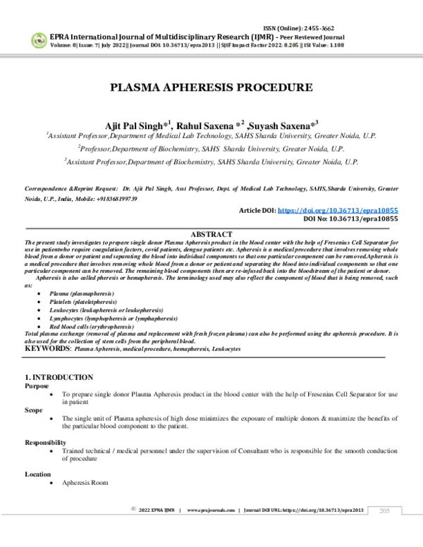 (PDF) "Therapeutic Apheresis" Plasmapheresis- A Review