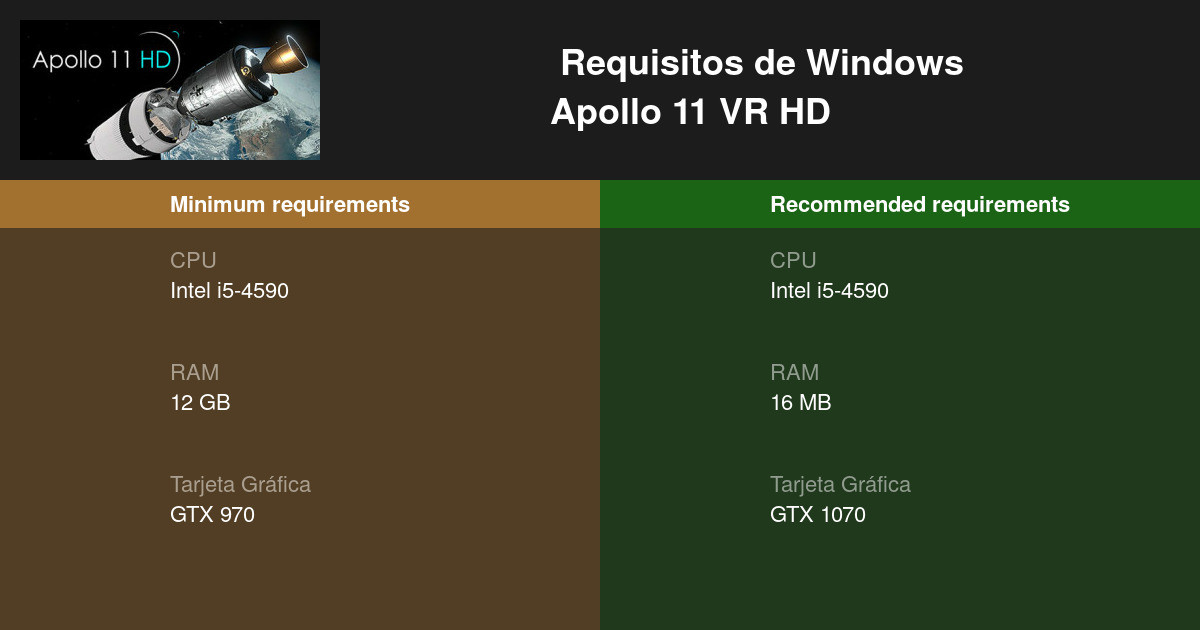 Apollo 11 VR HD Requisitos mínimos y recomendados 2026 - Prueba tu PC 🎮