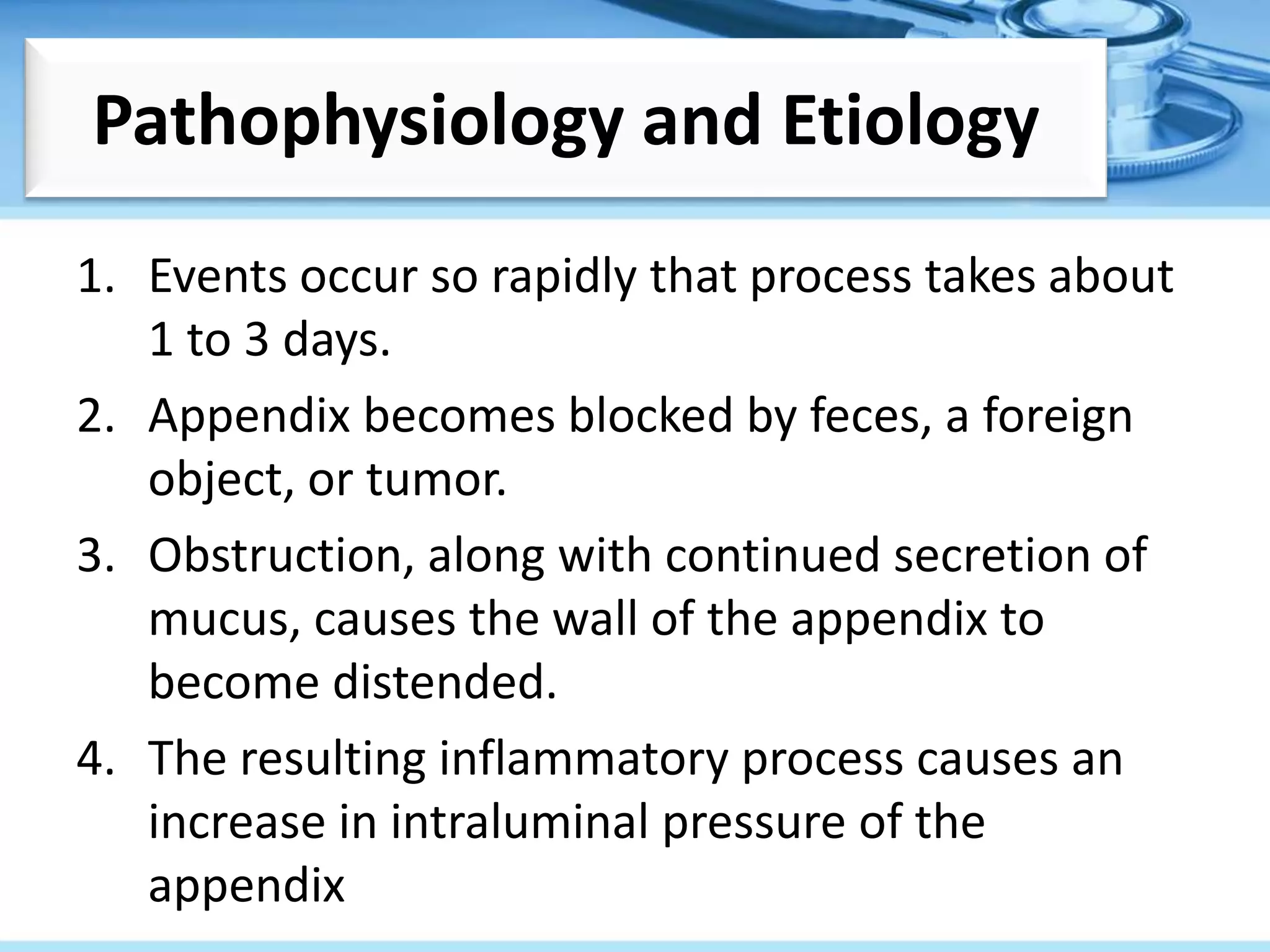 Appendicitis Pathophysiology Obstruction of lumen causes diffuse pain