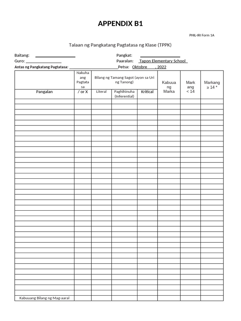Appendix B1 Phil-IRI Form 1A: Talaan NG Pangkatang Pagtatasa NG Klase ...
