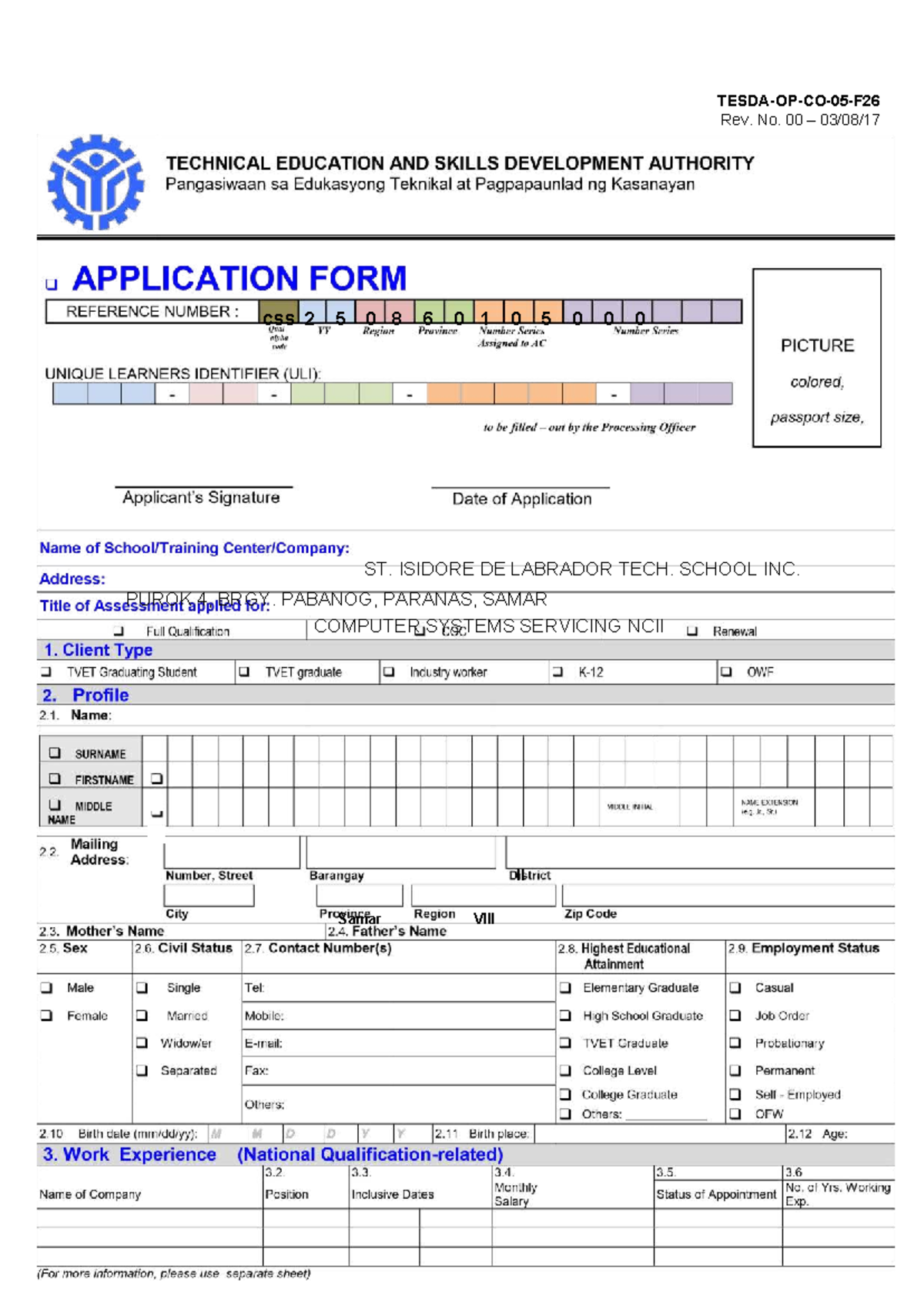 CSS NCII Application Sample - Admission Slip and Requirements - Studocu