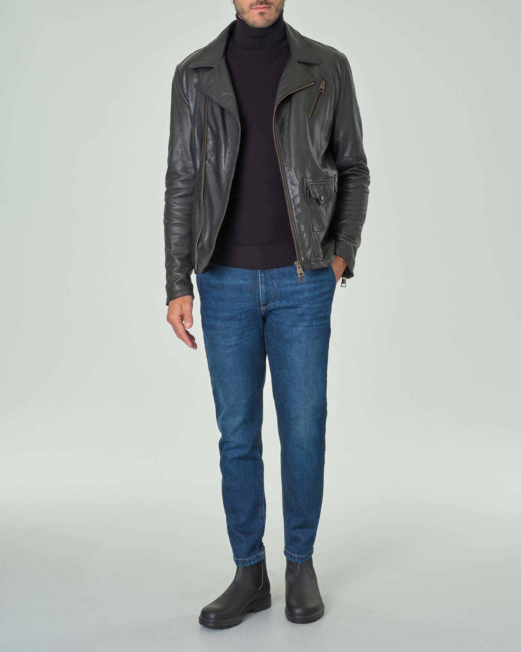 Chiodo nero in pelle con fodera in lana e taschino applicato davanti