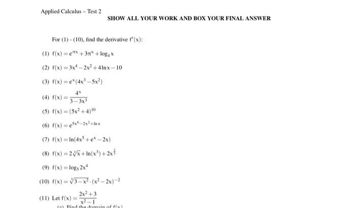 Solved Applied Calculus – Test 2SHOW ALL YOUR WORK For (1) - | Chegg.com